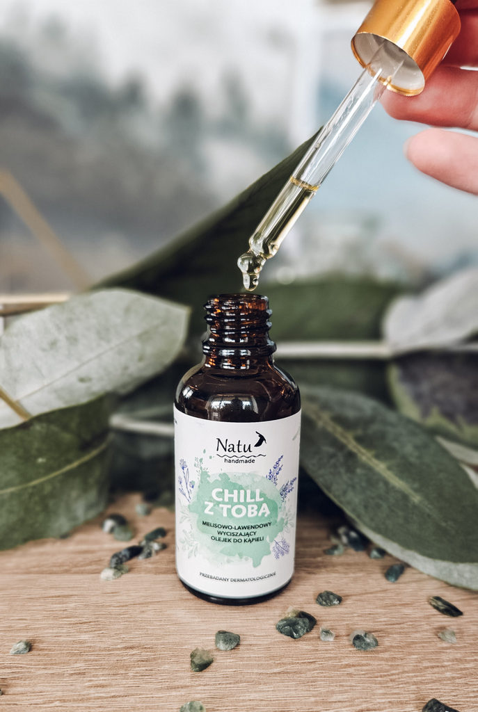 Chill z Tobą – melisowo-lawendowy olejek wyciszający wesprze Cię w wycentrowaniu się, wyjściu z głowy i kłębiących się tam ciasnych myśli, rozluźnieniu napięć w emocjach. Otuli zmysły, żeby kąpiel była jeszcze większą przyjemnością.