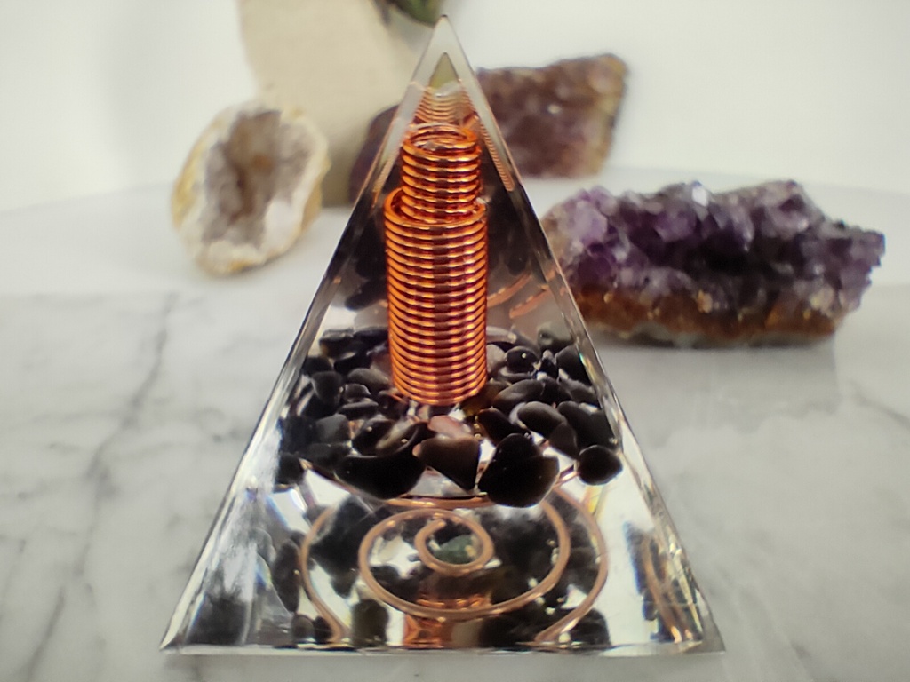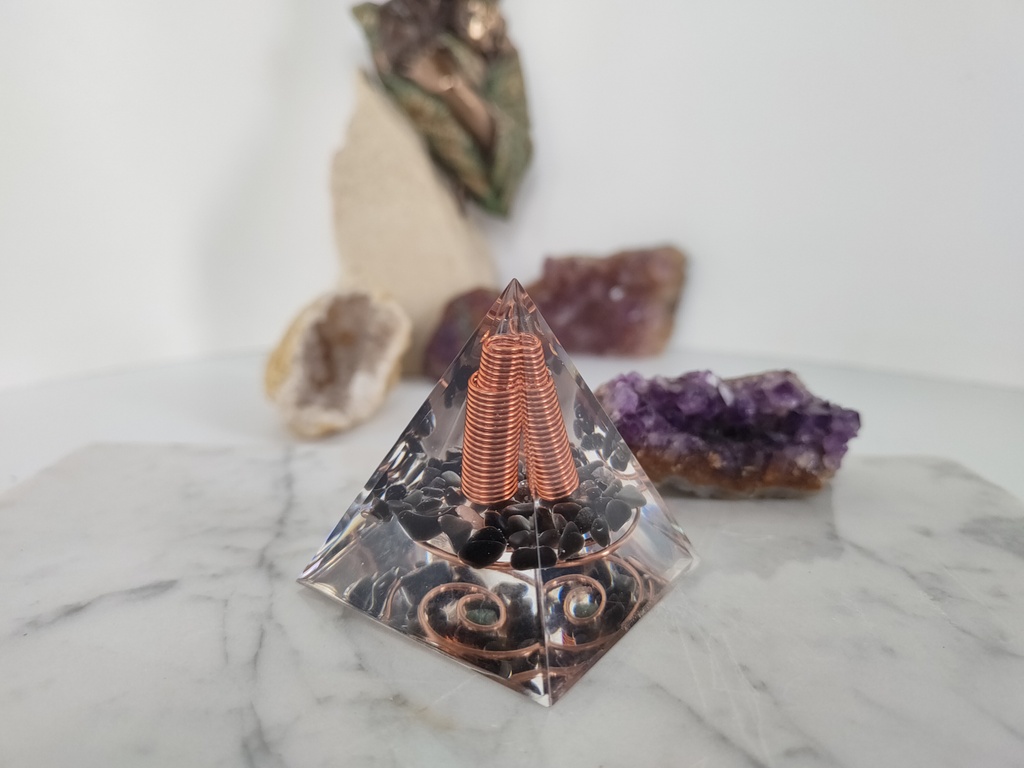 - Ochrona i oczyszczanie: Orgonitowa piramida działa jak energetyczny oczyszczacz. Neutralizuje negatywne wpływy elektromagnetyczne i zanieczyszczenia energetyczne.