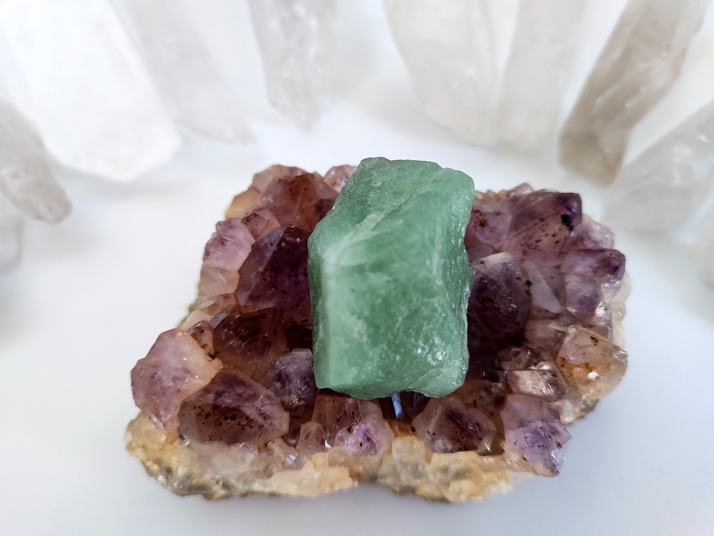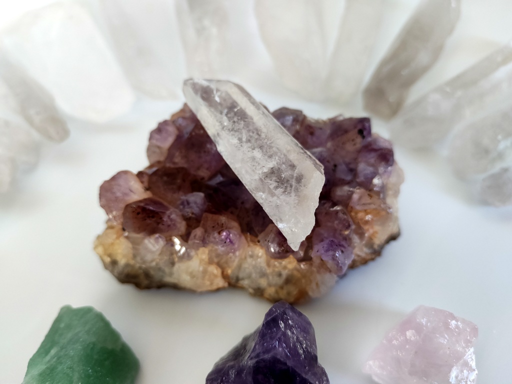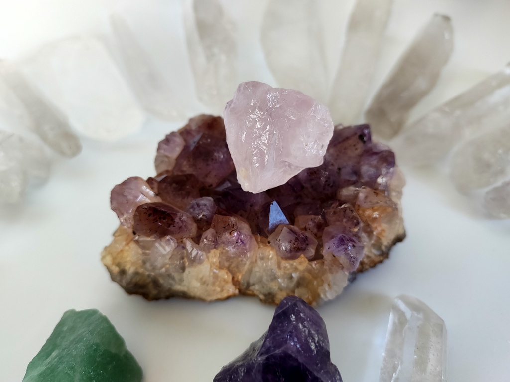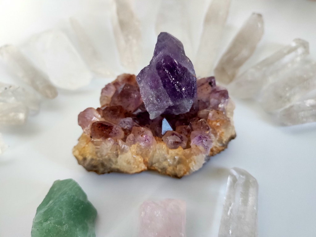 - Ametyst: Ten fioletowy kamień jest związany z duchowością i ochroną. Jego właściwości to: