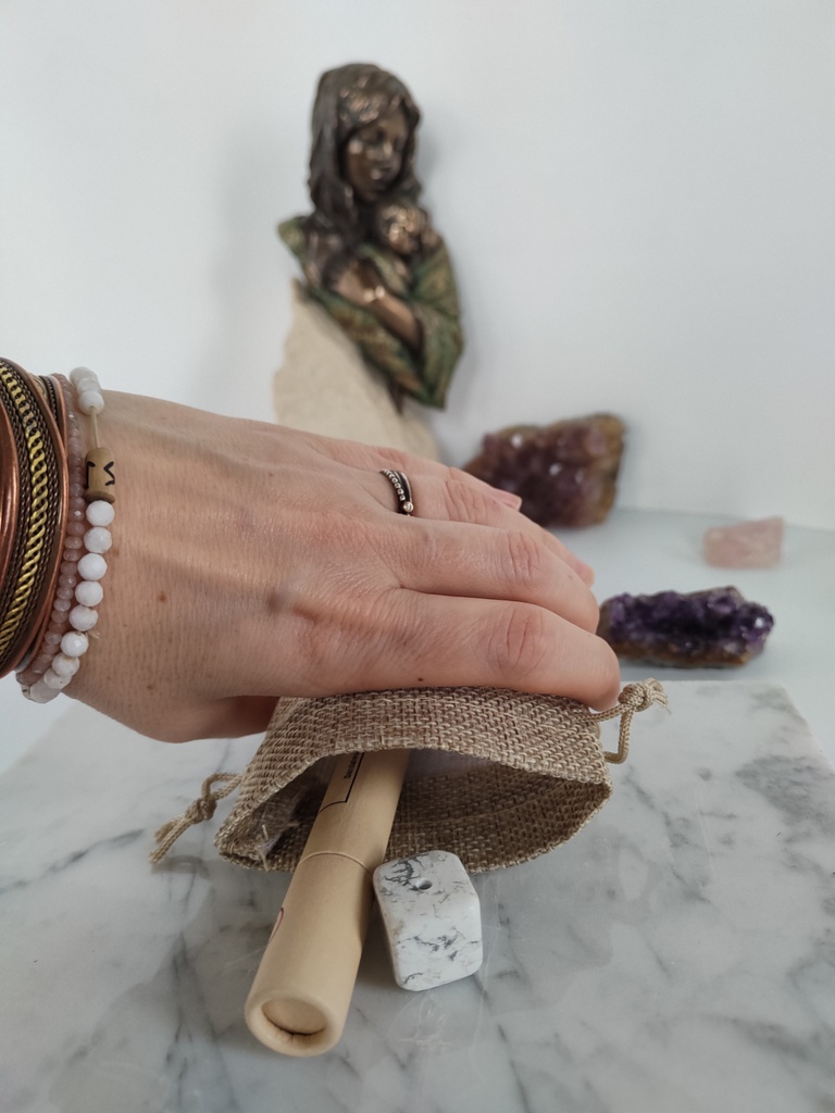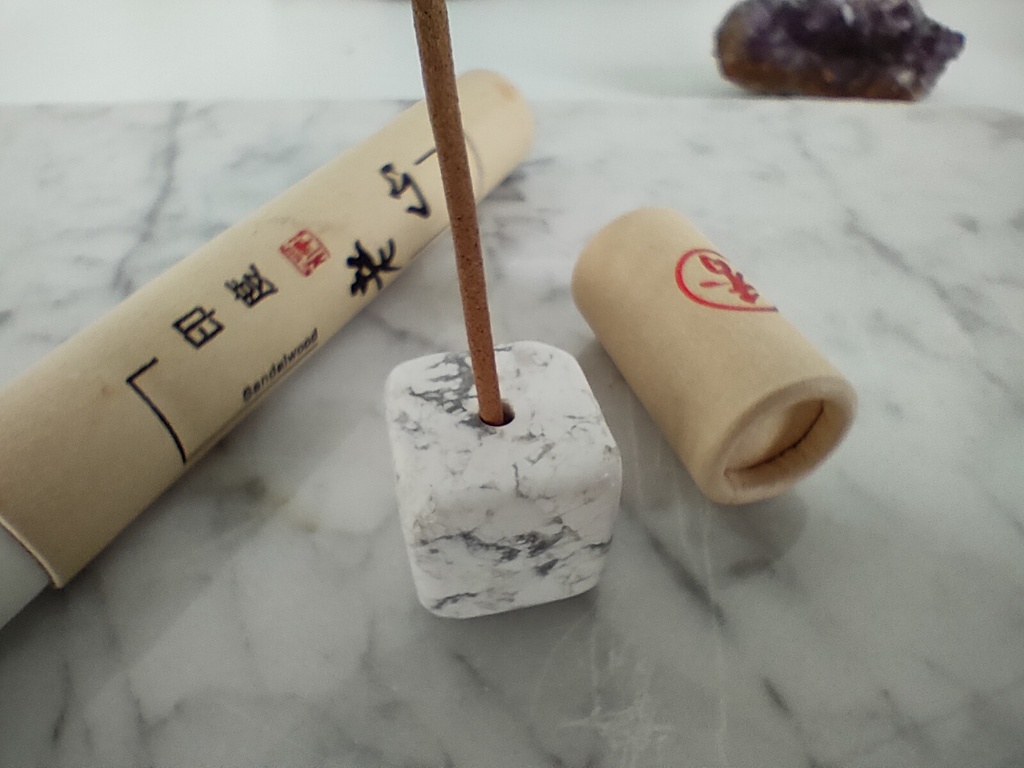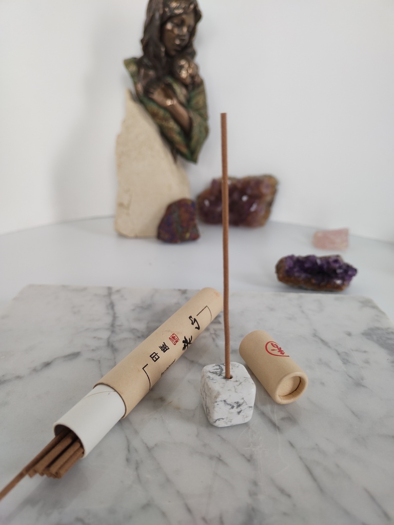 Zestaw ten łączy czystość białego turkusu z duchowymi właściwościami kadzidełka sandałowego, tworząc harmonijną kombinację do medytacji, ochrony i spokoju.